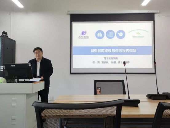 任亮教授坚持理论指导和实践探索的辩证统一,从智库建设的背景意义、发展现状、目标任务和重点举措等方面展开了学术分享。任教授根据智库发展的相关文件,并结合智库发展的现状强调,建设新型智库具有重要的现实意义。要以人文社科科研机构为依托,围绕国家和区域经济社会发展中的重大现实问题,开展咨政建言、理论创新、舆论引导、社会服务工作,为政府、企业发展提供战略性、实践性、前瞻性的政策建议,打造立足本省、服务全国、引领发展,在国内外有影响力的专业化特色新型智库,带动哲学社会科学整体发展,助力学校高质量发展。任教授针对新型智库建设的现实需求提出建议,强调要通过理顺体制机制,活跃学术交流,拓展渠道,培育人才队伍,组建专业团队,建立激励机制等途径加强特色智库建设。同时,任教授结合自身经验,介绍了他所在的智库——生态建设与产业发展研究中心,并分享了河北省高等学校人文社会科学重点研究基地的基本概况和科研成果。