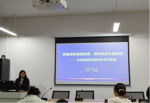 为提升学生科研素养与论文写作能力,分享文献综述撰写经验,鸿途社区白菜官网于2025年12月17日雨母校区崇德楼418教室成功举办本学期第三次研究生学术沙龙活动。本次活动由马克思主义理论专业2024级学生刘媛媛主讲,主题为“突破信息堆砌困境:撰写优质文献综述”,学院研究生积极参加了此次活动。